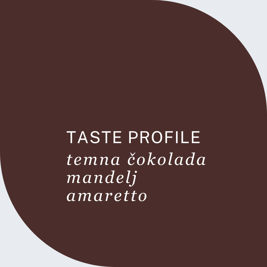 Klasika, ki izstopa. V skodelici prevladuje okus temne čokolade, ki ga dopolnjujejo okusi mandlja in amaretta. Kava ima polno do težko telo, uravnotežene kisline in bogato kremoznost, kar se pozna na dolgem čokoladnem pookusu.